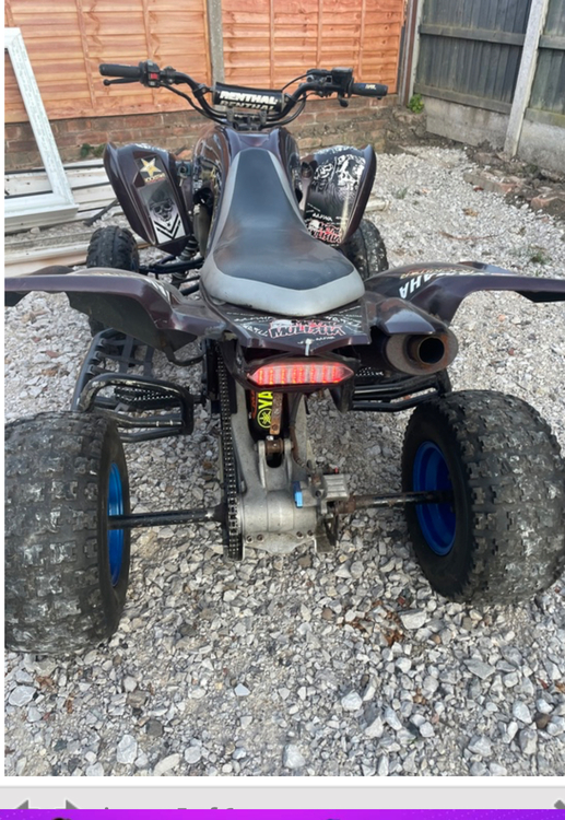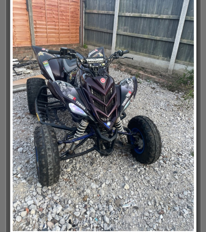 57 plate raptor 700 full log book runs ok exhaust guard loose so rattling a bit been sat for 3 years in garage fired up every couple of months charged battery fired up fine key switch broken so have to disconnect battery to switch off as you can see it’s got wear on panels a arms and swingarm as expected for a 2008 quad needs abit of Tlc hence tidy up but will be nice quad when sorted full logbook in my name please no time wasters