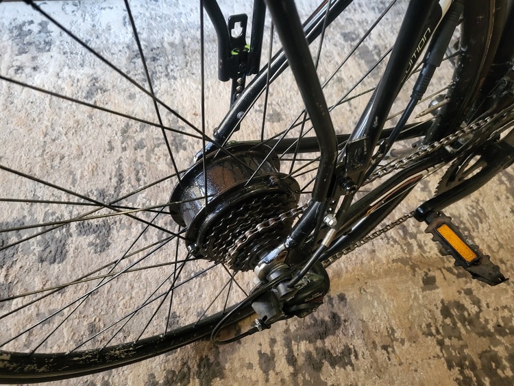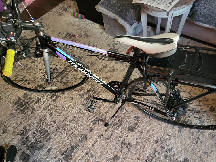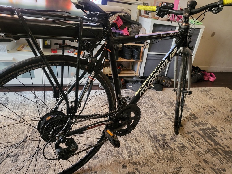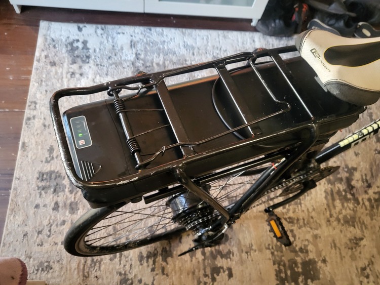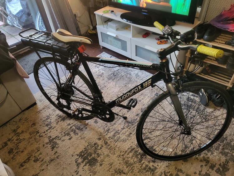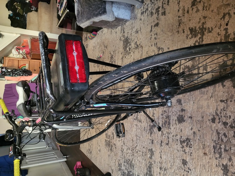 E bike 36 volt pedal assisted bike with the expensive bigger battery as you can see in pictures. Continental bigger 23mm tires for more range. 4 different speed settings and a range of about 50 miles on full charge and a max speed of 25mph on top speed. Bike rides and runs spot on and pretty clean condition. Anymore info just message me thanks...