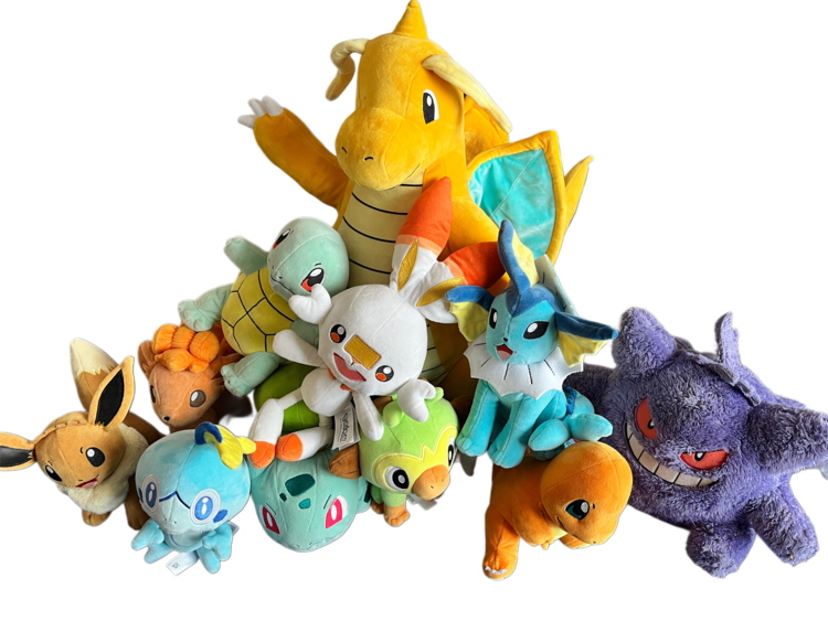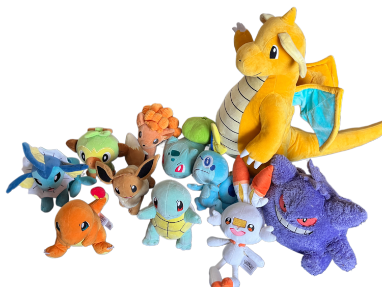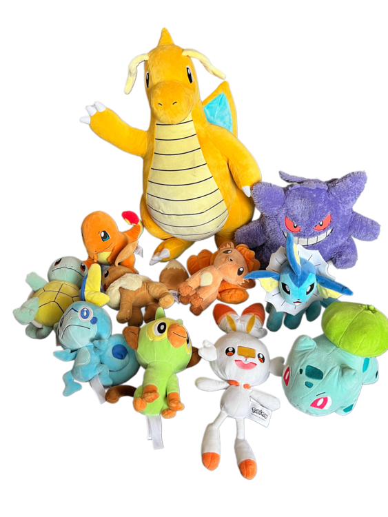 A collection of Pokémon plush characters in good condition. The large dragonite has a pen mark on foot.