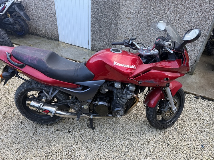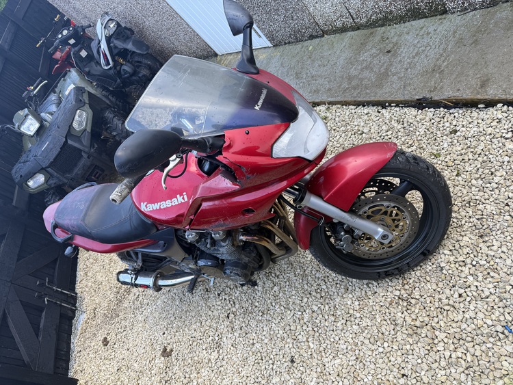 Kawasaki zr750 2002 sellin as spare and repair runs but bogs with choke of moted June 2026 full logbook one key front panel broke on one side rear brake had new pads wants bleedin up after market exhaust easy project for someone sold as seen at £350 or swaps