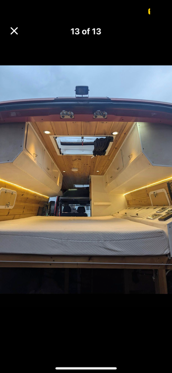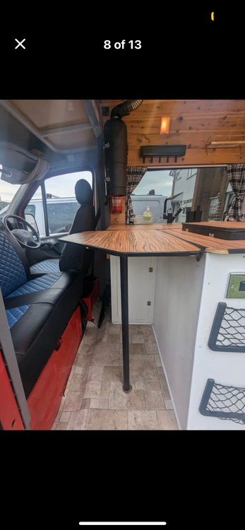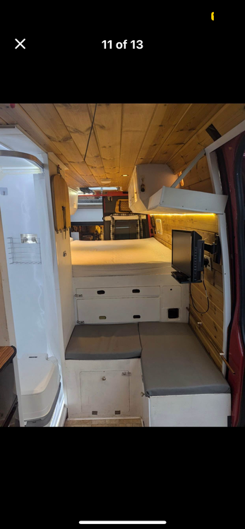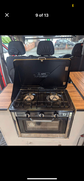 Fixed bed at rear end of van Fully offgrid, electrics with fusebox and caravan electric hook up for onsite- leasure batteries , split relay charging , 2000w inverter , solar panels , fuse box, 240v electrics with x6 plug sockets , diesel night heater with remote. Titan multi media player with touch screen and reverse camera also has apple car play with multifunctional steering wheels controls , Side door pull out awning with poles,caravan hookup, fridge freezer x2 hob with oven, sink with tap and water supply , working hot shower , hot water boiler , thetford portable toilet , washing machine in the back where storage space is and there is probably plenty I’ve missed out but will update