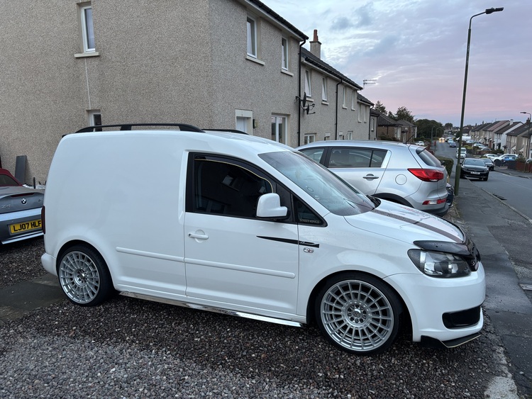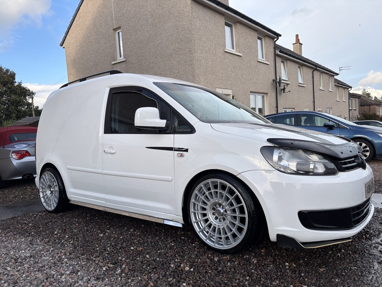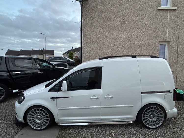 2011 11 plate vw caddy 1.6 tdi white in colour 19 inch rotiform alloys with new tyres fully carpeted in the rear r line seats lowered on coilovers bonnet protector chrome side skirts led reg bulbs upgraded front bulbs aftermarket screen with apple car play compatibility. Fitted towbar electric windows remote central 137000 miles locking recent discs and pads all round and rear calipers also had rear bushes fitted and a front wheel bearing nice clean honest wee van white is currently being used for mobile valeting stacks of recruits for previous work done looking to upgrade to something bigger so would ideally swap for another nice van with similar modifications to mine it’s mot till August 2026