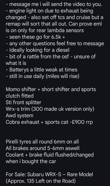 Wrx-s currently around 140 left on the Road out of the 300 made (uk only variant). This was the crossover between a standard wrx and the sti.