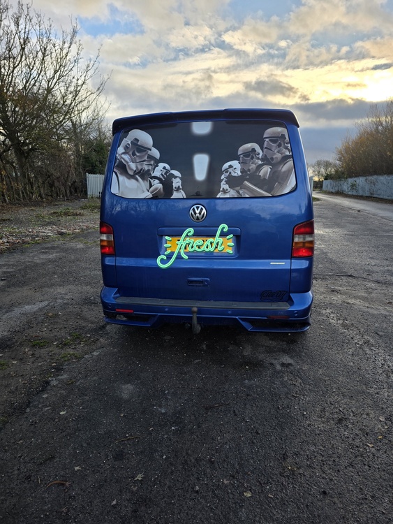 2005 volkswagen transporter t5 2.5 tdi 180bhp 6 speed manual 245k will go up as used daily 7 month mot 20" alloys wind deflectors tow bar single back door conversion windows in both sides rock & roll bed with seat belts t5.1 front end has double seat in front aswell now obviously 20 years old odd marks here & there v5 here fancy a change looking to swap no scrap