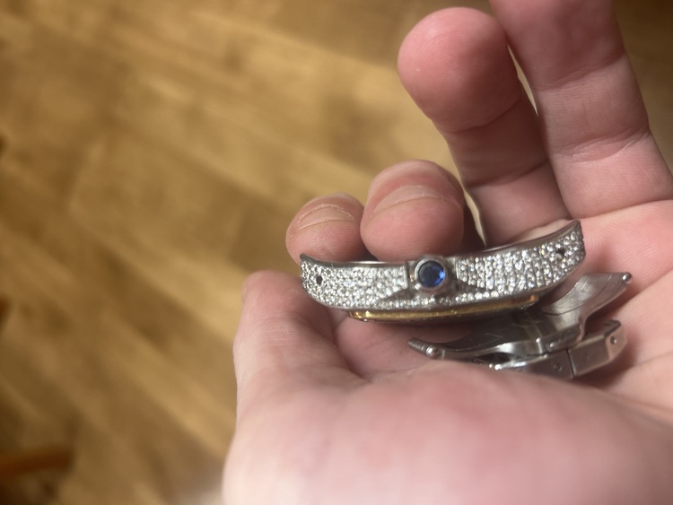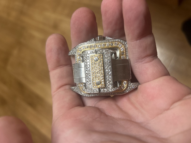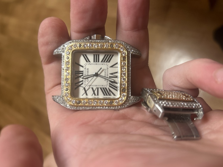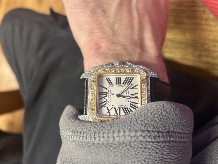 Lovely Cartier santos 100 in stainless and gold aftermarket diamonds done to the best I payed £13000 for the watch I know it ain’t worth what I payed probably close to half what I payed looking for a nice gold chain or anther watch someone stole my box with papers but can meet at any shop to verify its real will be on black strap