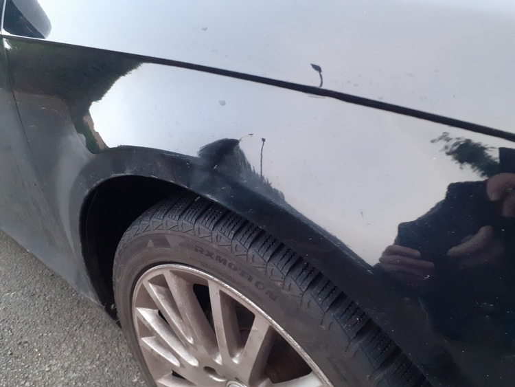 It does have a dent in the wing and 2 little holes in the bumper easy fix but it's never bothered us really