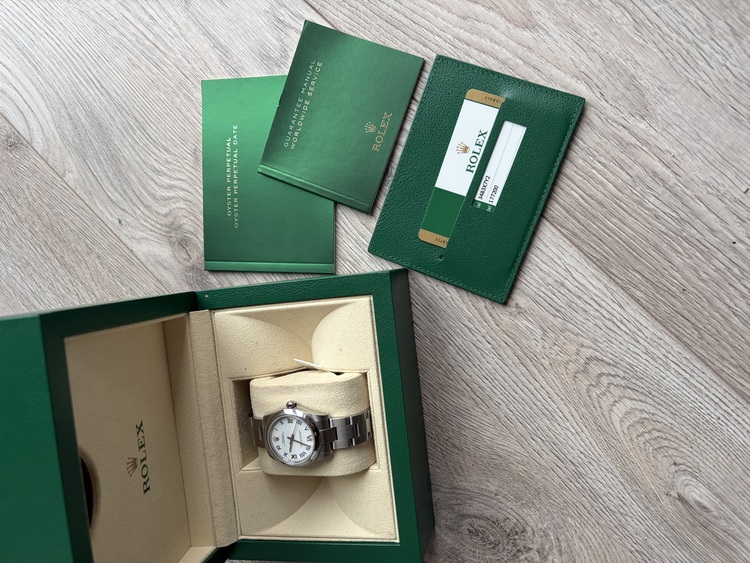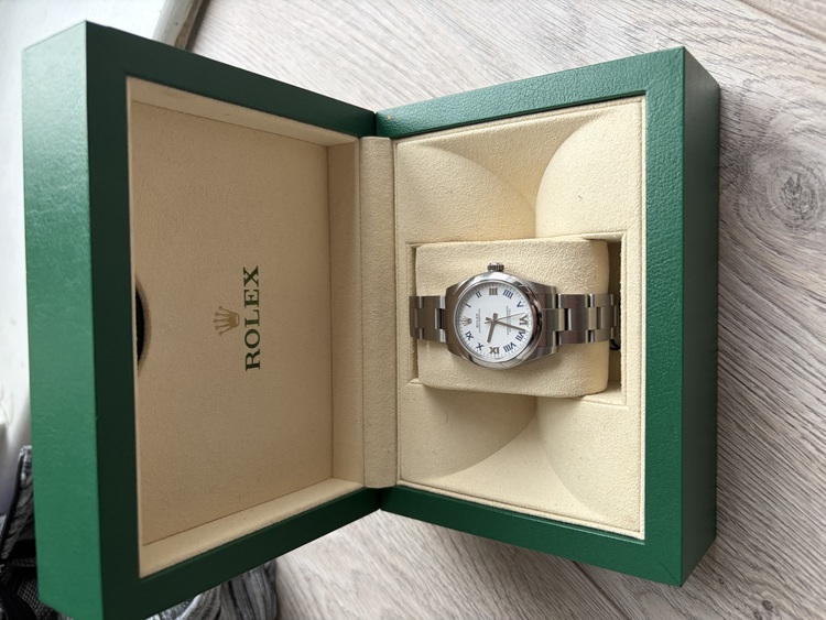 Offered for sale is a Rolex Oyster Perpetual 31mm with the elegant white Roman numeral dial, originally purchased in 2018. This watch is in new condition, with no marks, no scratches, and no signs of wear — exceptionally well preserved. Full set box and paper and watch register check willing to take any jewellers