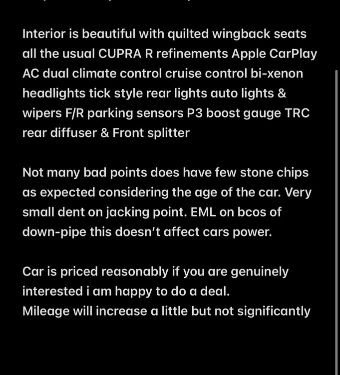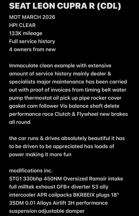 super clean example recently ceramic coated car has everything it's ever needed no expense spared always ran on 99RON fuel drives absolutely beautiful no knocks or leaks Great on fuel easily able to achieve 35MPG