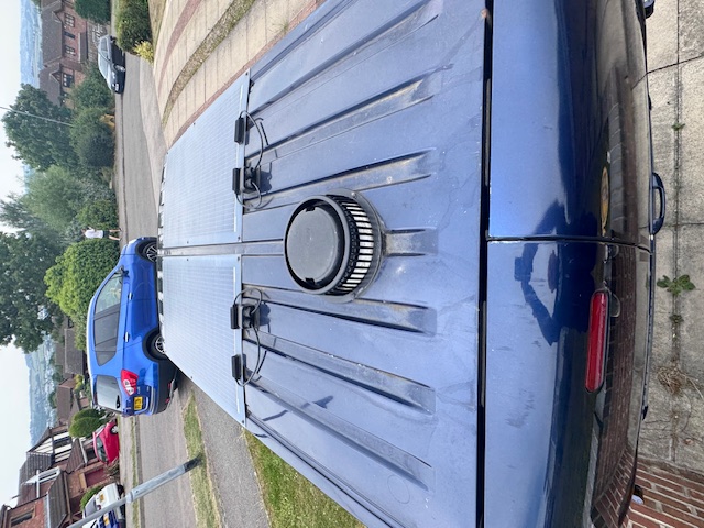 This micro camper has a TV in rear, twin batteries solar panels seat to small double bed, diesel heater
