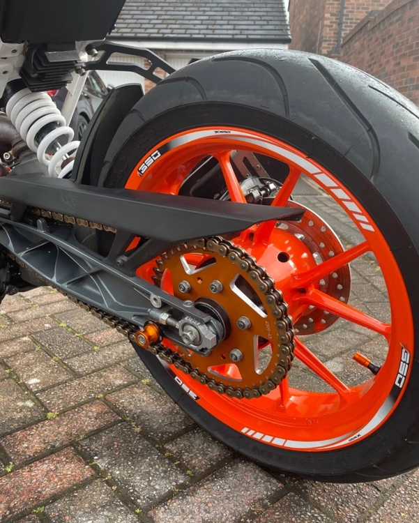 -43T anodised orange rear sprocket to lengthen final drive slightly (I found stock gearing a bit frantic. Stock rear sprocket with the bike for new owner.)