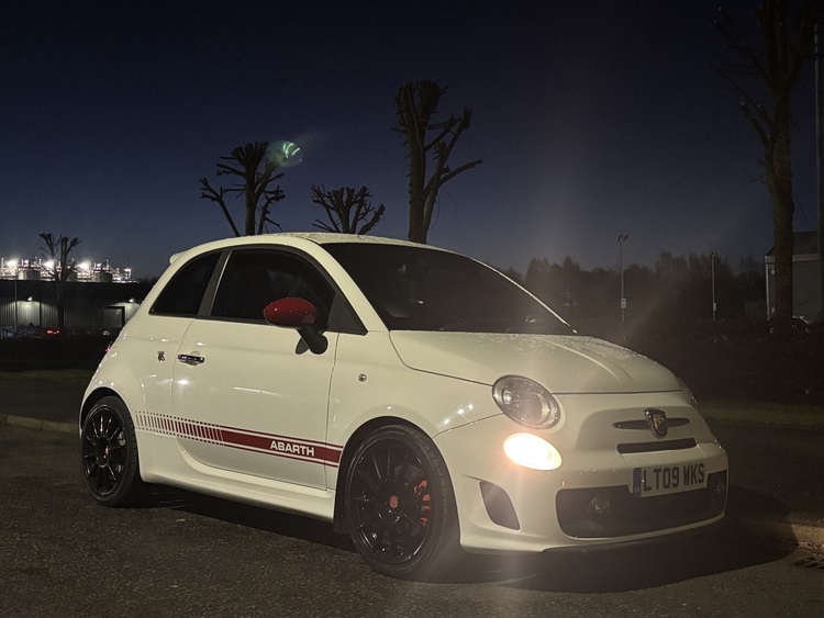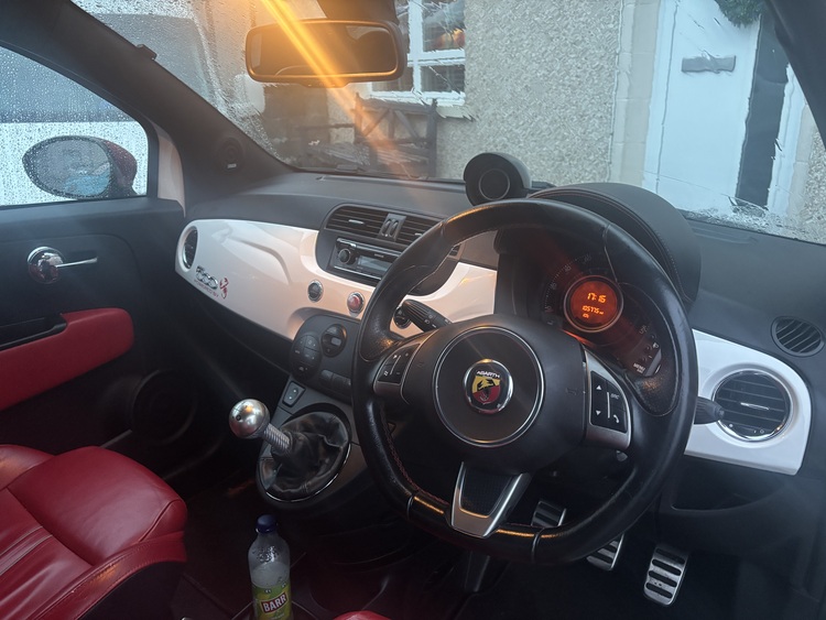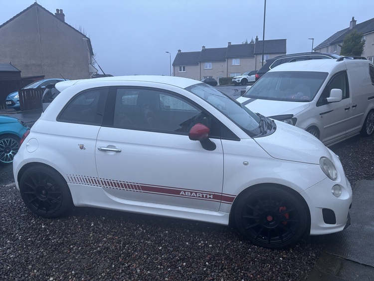 2009 09 plate abarth 595 white in colour red leather interior 17 inch alloys lowered on eibach springs remapped to 180 bhp recent new clutch timing belt shocks service brakes and a list of other stuff . Very clean wee car for year mot till end of August