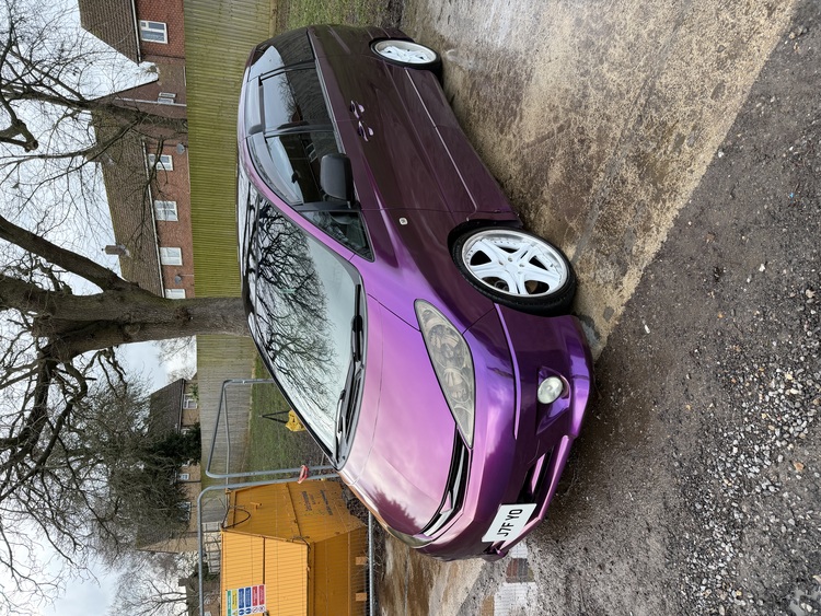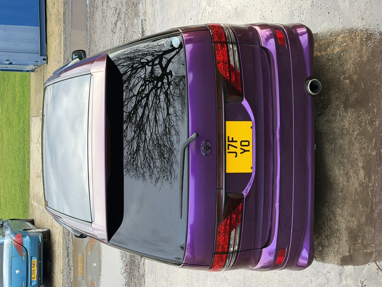 Full wrap in Teckwrap metallic purple with a gloss black roof (under the wrap is a factory pearl white paint job which was decontaminated and machine polished before the wrap)