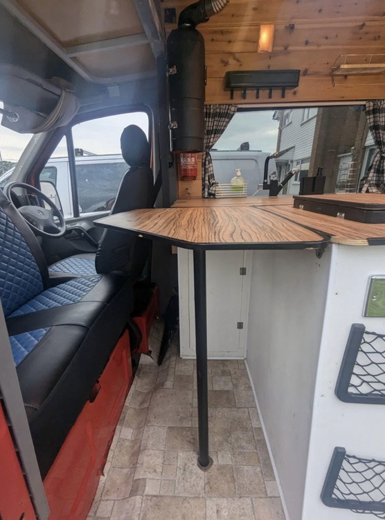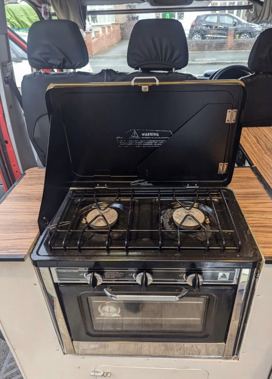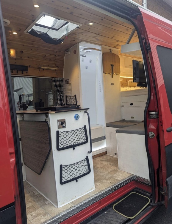 Fixed bed at rear end of van, diesel night heater with remote which is under the seating next to the bed but this has recently stopped working will be replaced with new one ,smoke alarm and carbon monoxide alarm , fire extinguisher, x2 skylight windows that open , x2 mini opening windows on each side of the bed, log burner , Titan multi media player with touch screen and reverse camera also has apple car play with multifunctional steering wheels controls , pull out awning with poles,fridge freezer, x2 hob with oven, sink with tap and water supply , working hot shower , hot water boiler , thetford portable toilet , dineing table , swivel passenger seats , washing machine in the back where storage space is and lights all the way through the van ,240v electrics with split relay charging system and solar panels with x2 leasure battery’s , 2000w inverter ,X6 Plug sockets , caravan electric hook up for onsite ,
