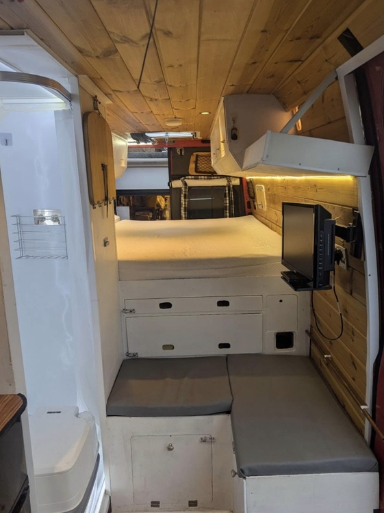 Fixed bed at rear end of van, diesel night heater with remote which is under the seating next to the bed but this has recently stopped working will be replaced with new one ,smoke alarm and carbon monoxide alarm , fire extinguisher, x2 skylight windows that open , x2 mini opening windows on each side of the bed, log burner , Titan multi media player with touch screen and reverse camera also has apple car play with multifunctional steering wheels controls , pull out awning with poles,fridge freezer, x2 hob with oven, sink with tap and water supply , working hot shower , hot water boiler , thetford portable toilet , dineing table , swivel passenger seats , washing machine in the back where storage space is and lights all the way through the van ,240v electrics with split relay charging system and solar panels with x2 leasure battery’s , 2000w inverter ,X6 Plug sockets , caravan electric hook up for onsite ,