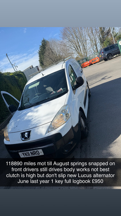 Peugeot partner 2011 mot till 22nd August not best looking van was parked up a few years ago I hit a pot hole 2 week ago just jacked it up snapped spring on front drivers still drives but you can feel it through steering wheel full leg on eBay £40 im not spending anymore onit had brand new lucus alternator last year starts straight up was ex fridge van makes a humming noise at around 65-70 through the old pipe system £950 or open to offers / swaps based in Sheffield I can meet I used it to go to Scotland last month message if interested