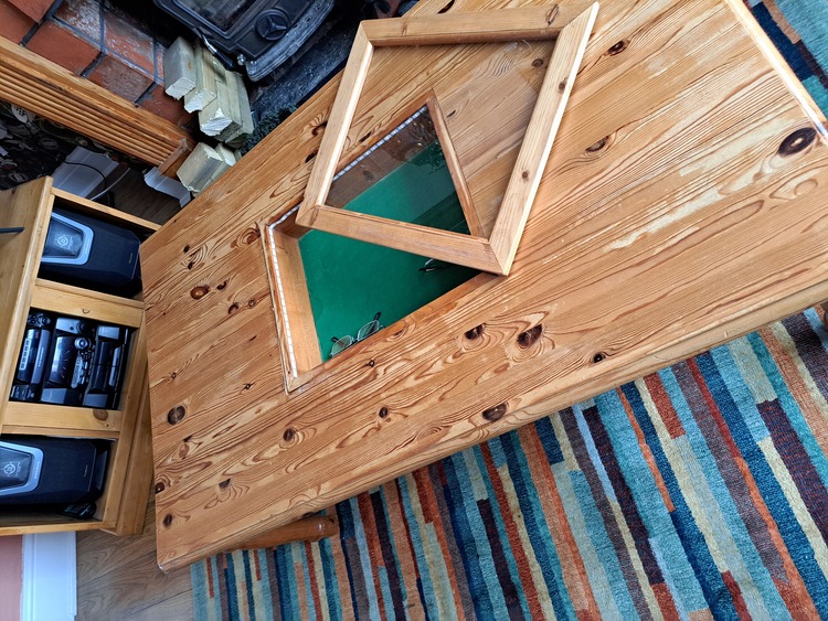 Large pine illuminated coffee table , lift of lid , ideal for endless items to display.